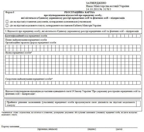 Форма №6 – це реєстраційна картка, яку юридична особа щорічно надає державному реєстратору з метою підтвердження основних відомостей про підприємство, внесених в Єдиний державний реєстр юридичних та фізичних осіб-підприємців.